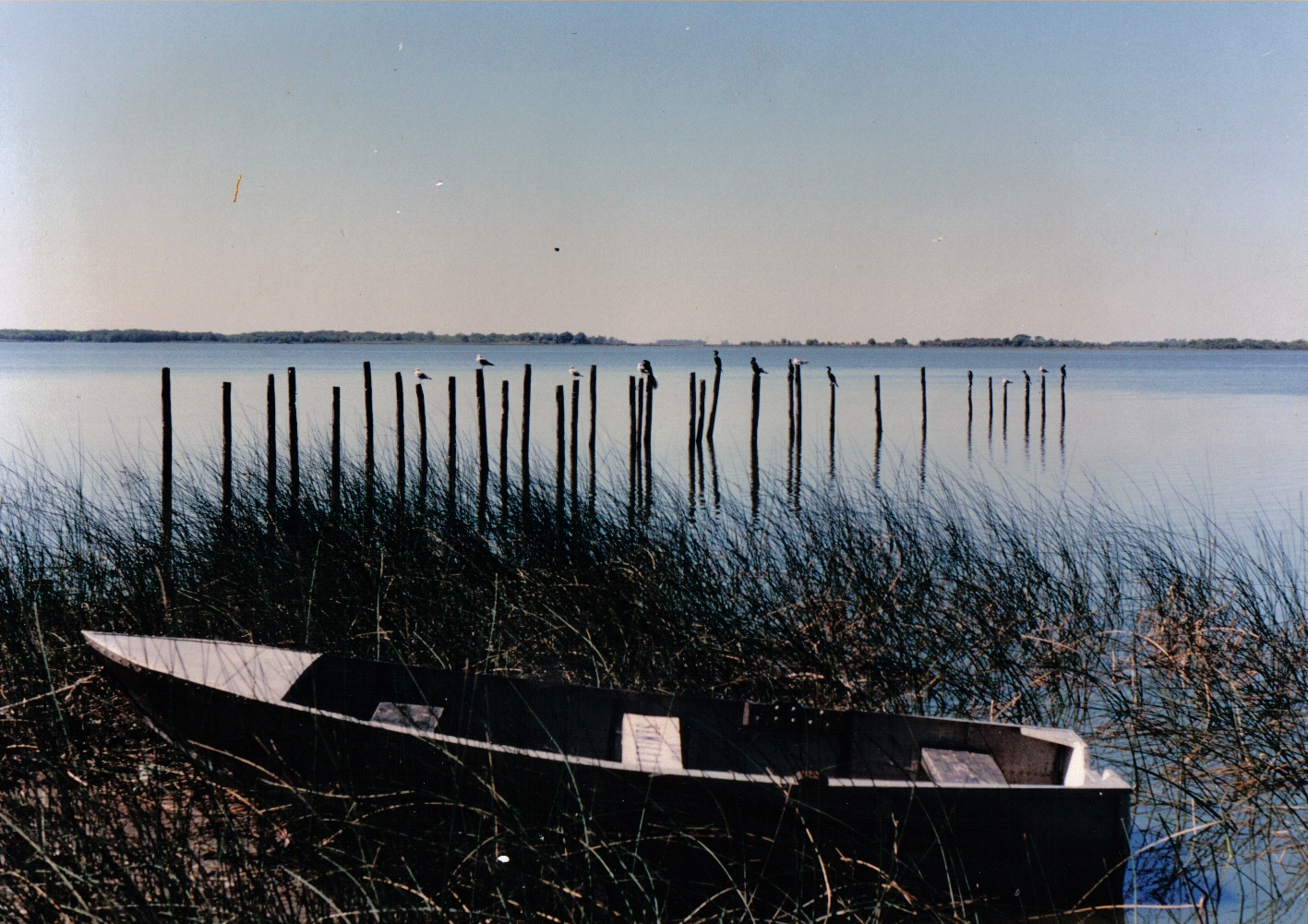 La imagen muestra una vista serena de un cuerpo de agua con una barca en primer plano, rodeada de juncos altos. En el fondo, una fila de pilotes de madera se extiende sobre el agua, con algunas aves posadas en ellos, y un horizonte distante de tierra y cielo. Interpretación Artística